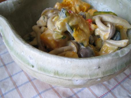 ②鍋に湯を沸かし、かぼちゃ、しめじの順で茹で火が通ったら湯を切り冷まします。