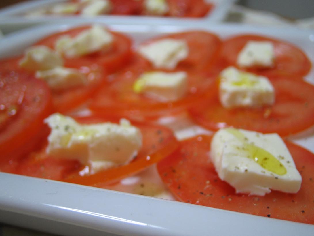 トマトをスライスをしたら、その上にクリームチーズをのせ、塩、ブラックペッパーを適量振り、オリーブオイル をタラリ~ンと掛けたら出来上がりです。